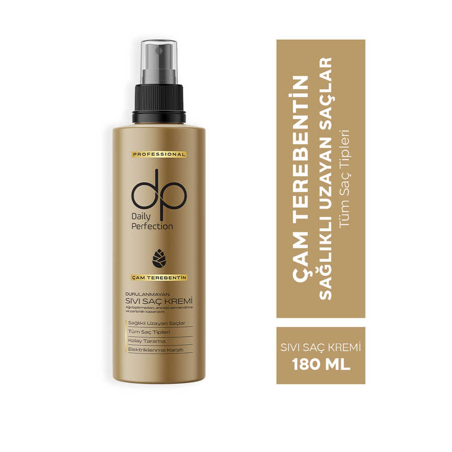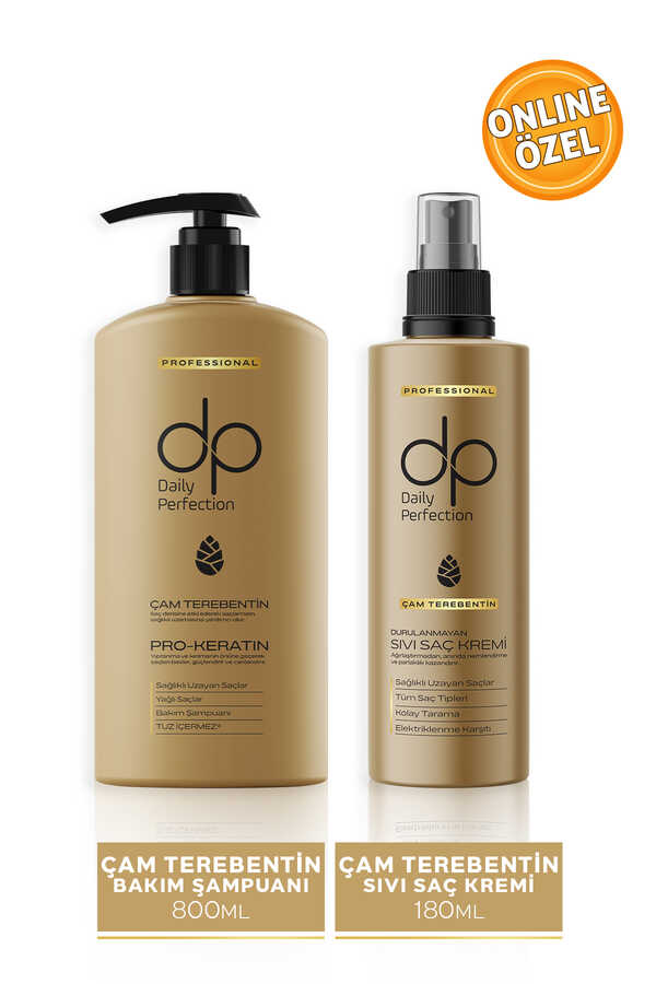 dp Daily Perfection Çam Terebentin 800 ml şampuanı ve çam terebentin 180 ml sıvı saç bakım kremi, sadece online satışa özel bu ekonomik setle saç bakım rutininizi tamamlayın! tuz içermeyen ve PRO-KERATİN özel formülüyle saç derisine ve saça yıpratmadan bakım sağlar.dp Daily Perfection Çam Terebentin PRO-KERATİN şampuanı zenginleştirilmiş formülü sayesinde saçlarınıza derinlemesine bakım yapar ve hızlı uzamasına yardımcı olur. Saçlarınızı yıpratmadan temizleyen bu şampuan, saç köklerini besleyerek sağlıklı uzamayı destekler. Ayrıca içerdiği biotin, keratin proteini sayesinde saçlarınızı güçlendirirken kırılmalara karşı koruma sağlar. Çam Terebentin yağı ile saçlarınız canlanır, güçlenir ve doğal parlaklığını geri kazanır.dp Daily Perfection çam terebentin 180 ml sıvı saç bakım kremi, saç bakımında benzersiz bir deneyim sunan özel formülümüz, saçlarınızın sağlıklı, parlak ve canlı görünmesini sağlar. İçeriğindeki Çam Terebentin özü, saçlarınızın sağlıklı bir şekilde uzamasına destek olurken saçları ağırlaştırmaz. Saçlarınıza ipeksi bir yumuşaklık kazandırır ve anında kolay taranabilirdik sağlar.Her zaman güçlü, parlak ve canlı saçlara kim sahip olmak istemez? Yeni dp Daily Perfection şampuanı ve çam terebentin 180 ml sıvı saç bakım kremi setiyle bu artık mümkün. dp Daily Perfection Çam Terebentin serisi ile her gün sağlıklı ve güçlü saçlara sahip olun!dp Daily Perfection Çam Terebentin tuzsuz şampuanı ve çam terebentin 180 ml sıvı saç bakım kremini mutlaka dene!dp Daily Perfection profesyonel saç bakım şampuanları ile günün her anında mükemmelliği yaşa!ÜRÜN ÖZELLİKLERİÇAM TEREBENTİN | Çam terebentin yağı saçlarınızın hızla uzamasını sağlarken güçlü, canlı, parlak saçlara sahip olmanızı sağlayacaktır, saçlarınızın koparak dökülmelerinin önüne geçmiş olacaksınız.KERATİN BAKIM | Keratin içeren özel formülle saçlara ihtiyacı olan vitaminleri kazandırarak bakım yapar. Hasar görmüş saçları onarır, saçların her zaman sağlıklı ve parlak görünmesini sağlar.BİOTİN DESTEĞİ | Biotin desteği zayıf saçları güçlendirerek saç dökülmelerinin önüne geçer. Saç kalitesini artırır ve daha sağlıklı uzamasını sağlar.